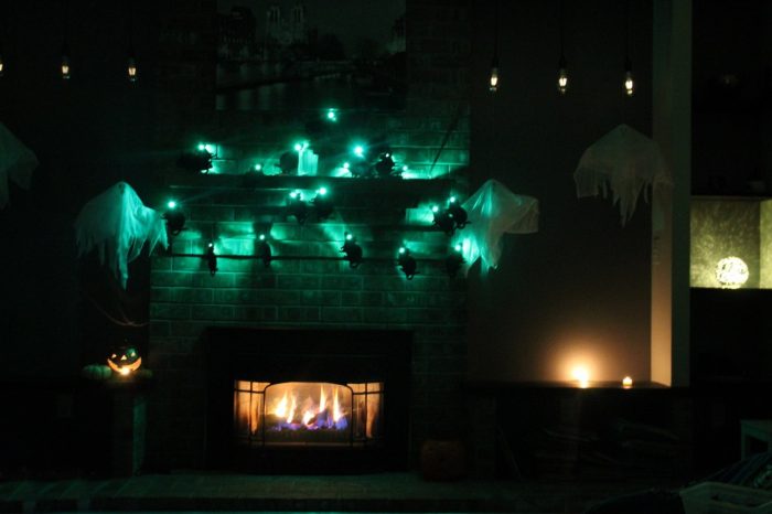 У нас уже пару недель оформлено вот так. Внизу по полочкам и на полу стоят тыквы, которые любовно выставляет Тимофей.
