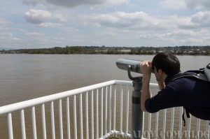 Вова ещё поглазел по сторонам в бинокль,который стоит на пристани для детей. Я тоже посмотрела в него, но особо ничего интересного там не увидишь – он не разворачивается в сторону домов 🙂